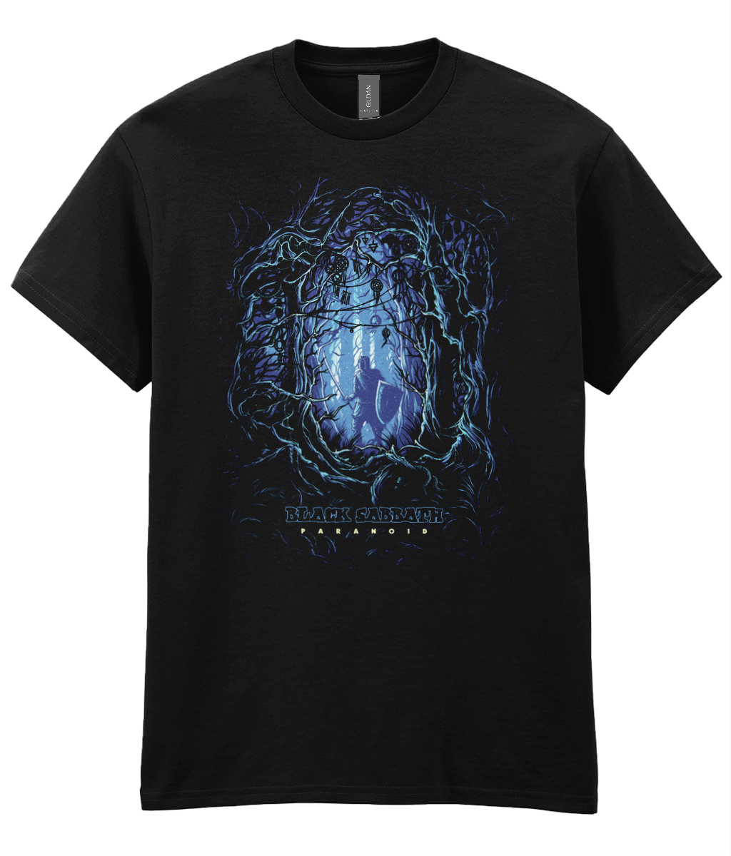 The front design of this shirt is truly eye-catching. It features an eerie, atmospheric graphic rendered in shades of electric blue and black, creating a hauntingly beautiful effect. At the center, you’ll find a shadowy figure surrounded by twisted branches, as though emerging from a dark, supernatural forest. Beneath the artwork, “Black Sabbath” is prominently displayed, alongside the word “Paranoid,” referencing one of the band’s most iconic albums.