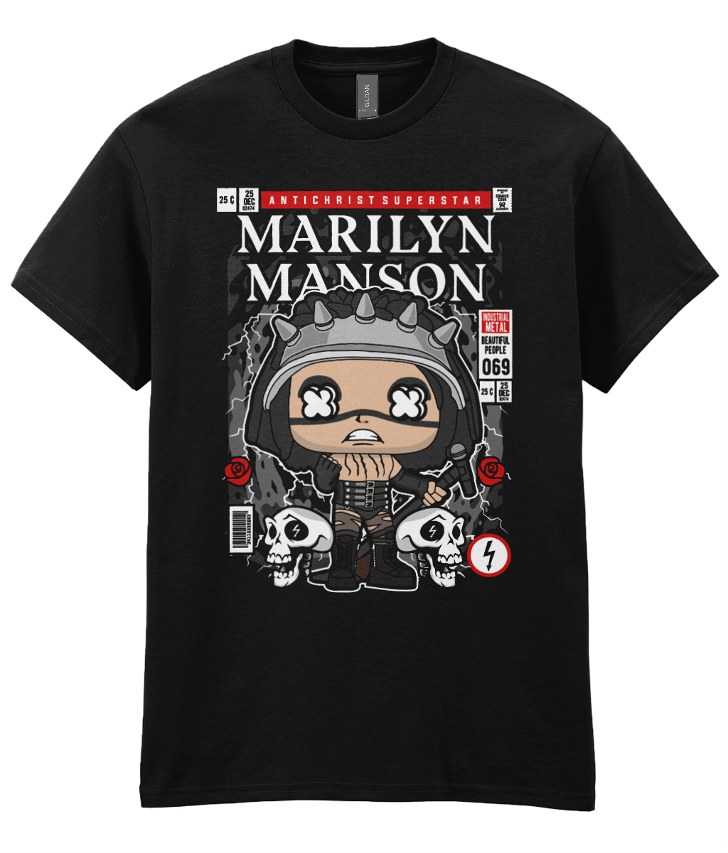 Step into the world of shock rock and bold self-expression with this striking Marilyn Manson T-Shirt. Designed in a unique funko pop comic style, this shirt takes Marilyn Manson’s larger-than-life persona and transforms it into a collectible-inspired piece of wearable art. Whether you’re a longtime fan of his dark, theatrical stage presence or you just love statement tees that grab attention, this shirt delivers everything you need to make a powerful impression.