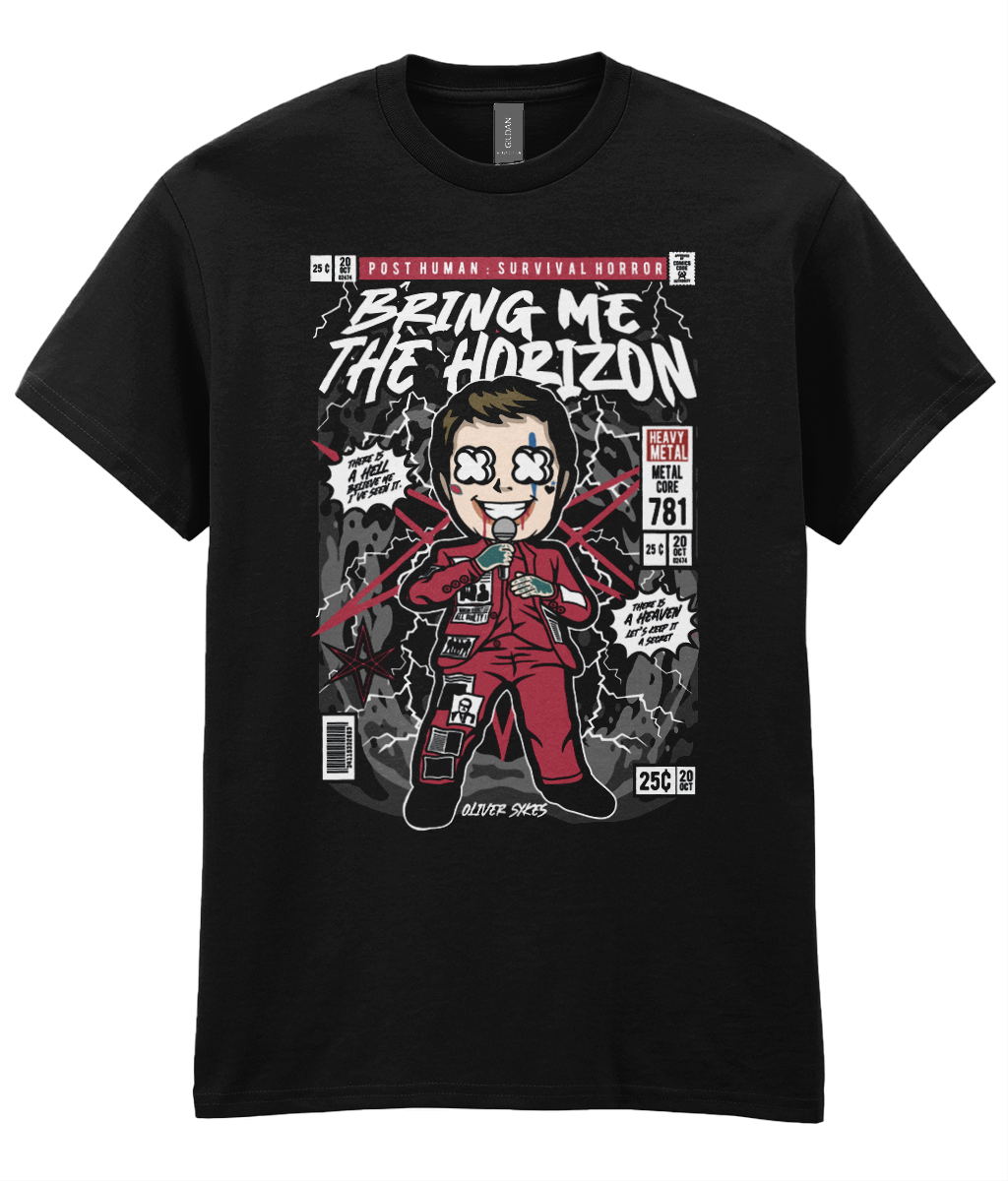 The design on this shirt is as dynamic as Oli Sykes himself. It features a cartoon-styled depiction of the vocalist in a bright red jumpsuit, holding a microphone as if mid-performance. His eyes are designed in a comic book X style, adding to the pop art aesthetic. Behind him is a roaring crowd, lightning bolts, and bold comic details such as “Heavy Metalcore” and issue-style numbers, making the shirt look like the cover of a vintage comic.